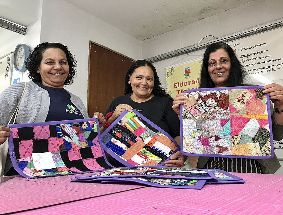 The Eldorado Embroiderers at ACER Brasil are celebrating their seventh anniversary this month! In March 2017, 20 women and children started to meet in small groups for a few hours each week with Carol, their teacher, to learn how to embroider and how to use a domestic sewing machine. Now, 35 embroiderers and 10 teenage fashion students are taught by a team of 5 teachers and monitors, who also learnt their skills at ACER, in a large, dedicated workshop equipped with industrial sewing machines. Many of the women take additional courses held at ACER by local quangos and philanthropic organisations on, for example, garment making or entrepreneurship. They also celebrate birthdays in their workspace - the oldest in the group is Lucia, a lively great-grandmother who recently turned 80 - and they attend events such as Zumba sessions organised by ACER. As part of a vibrant and supportive textile group, their social lives have been enriched, and many of them report that their mental wellbeing has improved as a result of their participation.