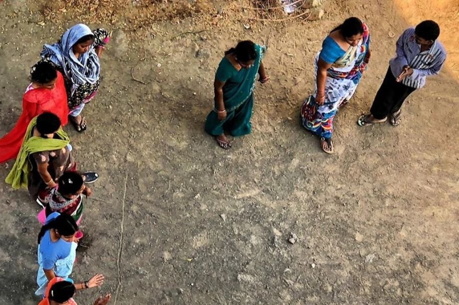 Photo Description: a picture of a group of people outside Faith Home (Ongole) taken from above. They are standing in two distinct lines: a line of seven individuals from the top left corner of the picture to the bottom left, and a second line of three individuals from top left to right. They’re all wearing colorful outfits.