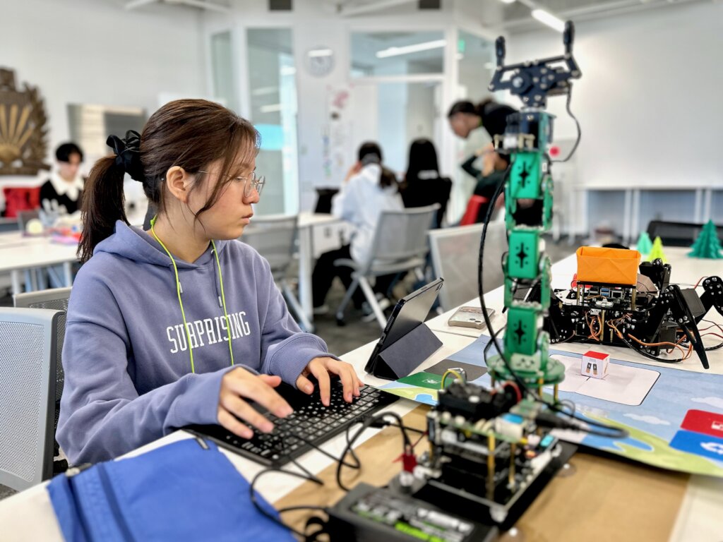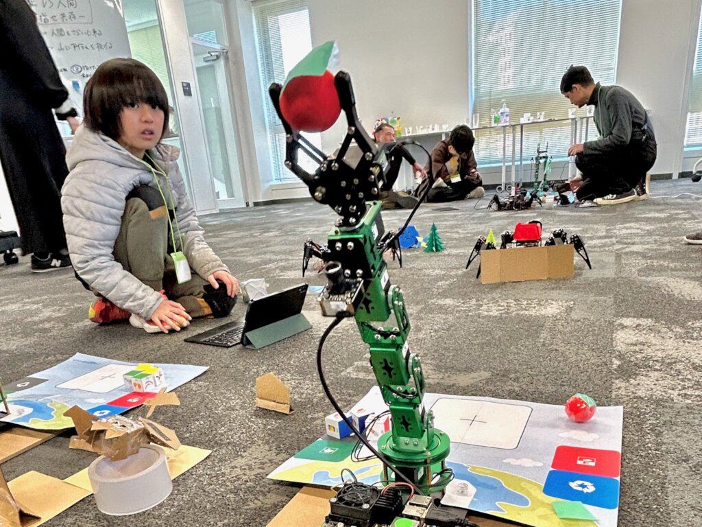 Robot arms can grasp objects and throw them. Throwing is actually a bit difficult and requires programming, but through so-called vibe coding, in which the children talk to the robot in Japanese about what they want it to do, they repeated trial and error and eventually managed to get the robot arm to toss a ball just a little. Meanwhile, the hexapods can carry objects on their backs.