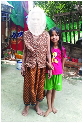 Madam U requires near constant supervision. She cannot be left alone. She is often confused and engages in erratic behavior. Seen here with a granddaughter, Madam U’s former so-in- law , his wife and 2 daughters all live together in the small house which Madam U owns. She had received a small plot of land outside of Phnom Penh 25+ years ago during the redevelopment and resettlement of residents of the Phnom Penh slum where she lived. Our program then helped Madam U to build her modest house , which now continues to provide a home for her and for her former son-in-law, who eventually remarried after the death of his wife. He and his second wife and their 2 daughters continue to live with Madam U as a family. His work as a daily construction worker provides an unreliable income. Consequently, the family has a subsistence lifestyle, where combined efforts provide just enough income for the famiily to survive. We provide a $110 per month food allowance for Madam U.