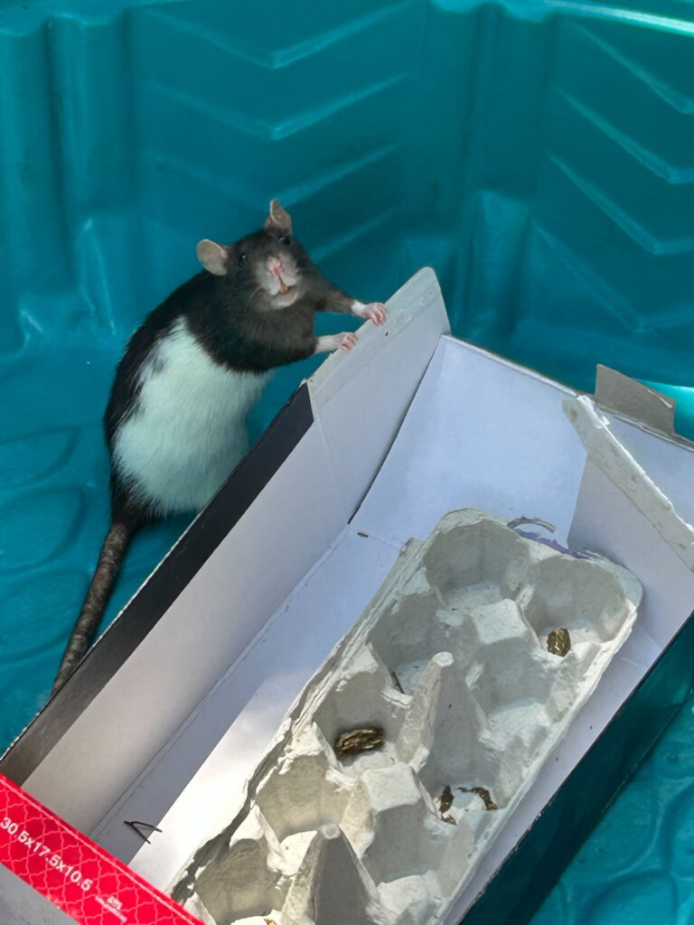 We are excited to continue improving our enrichment plan for our animal ambassadors! Enrichment is a very important, although often overlooked, part of animal husbandry that helps our ambassadors use their natural behaviors while they are in our care. We are grateful to the Girl Scout troop that visited us in June and brought homemade enrichment for some of our ambassadors! The rat pack enjoyed exploring their mazes and Basil the rabbit savored the treats he found in his foraging box.