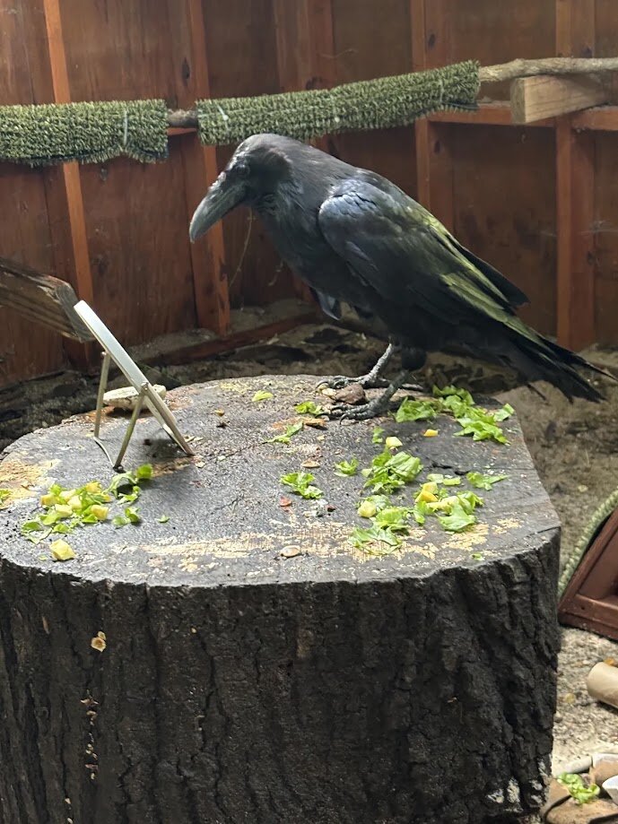Edgar, our Common Raven heavily relies on enrichment. Common Ravens are brilliant birds whose intelligence is comparable to that of a human toddler. Enrichment, such as food hidden in puzzles, sounds, and ropes, is all around his enclosure. This enrichment allows Edgar to be challenged and stimulate his brain by solving physical puzzles, tearing paper and ropes, and interacting with objects that make different sounds. Edgar currently has the oldest enclosure on our site. We make upgrades where possible, such as adding new gravel to his floor and replacing perches, but he is due for a new enclosure. With your help, we can continue to provide enrichment and upgrade enclosures for all of our Wildlife Ambassadors, including Edgar!