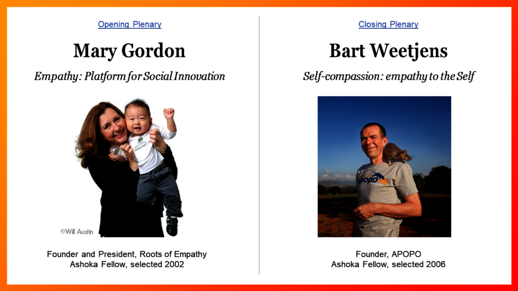 We will also welcome two internationally acclaimed Ashoka Fellow Social Entrepreneurs, Mary Gordon, Founder and CEO of Roots of Empathy, and Bart Weetjens, Founder of APOPO and The Wellbeing Project. Both Mary and Bart have generously agreed to provide Keynote addresses; "Empathy & Social Innovation" Mary Gordon, and "Self-Compassion: Empathy to the Self" Bart Weetjens. Their videos will be made available at the beginning (March 28) and closing of the Symposium (April 2), respectively.