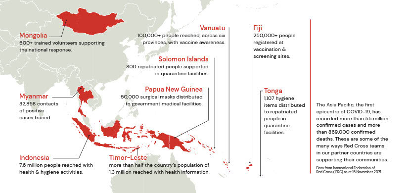 Countries in the Asia Pacific region continue to experience new waves of COVID-19 infections, which have threatened to overwhelm hospitals and already fragile health care systems. Local Red Cross and Red Crescent teams have been responding to the pandemic since the very beginning.