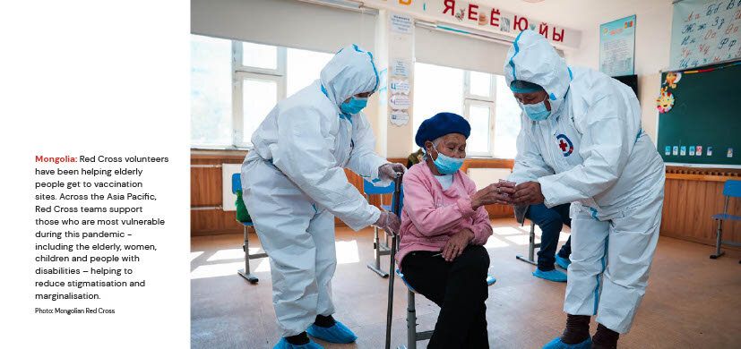 Across Asia Pacific, local Red Cross and Red Crescent teams have been working tirelessly to help contain the spread of the virus over the last year, working with governments to get people vaccinated as quickly as possible, raising public awareness around the importance of vaccines, including dispelling any vaccine hesitation. They are also disseminating health and hygiene messages, providing medical care, medical equipment, and personal protective equipment, providing psychosocial support and distributing other essential relief, such as food, cash grants and emergency shelter.