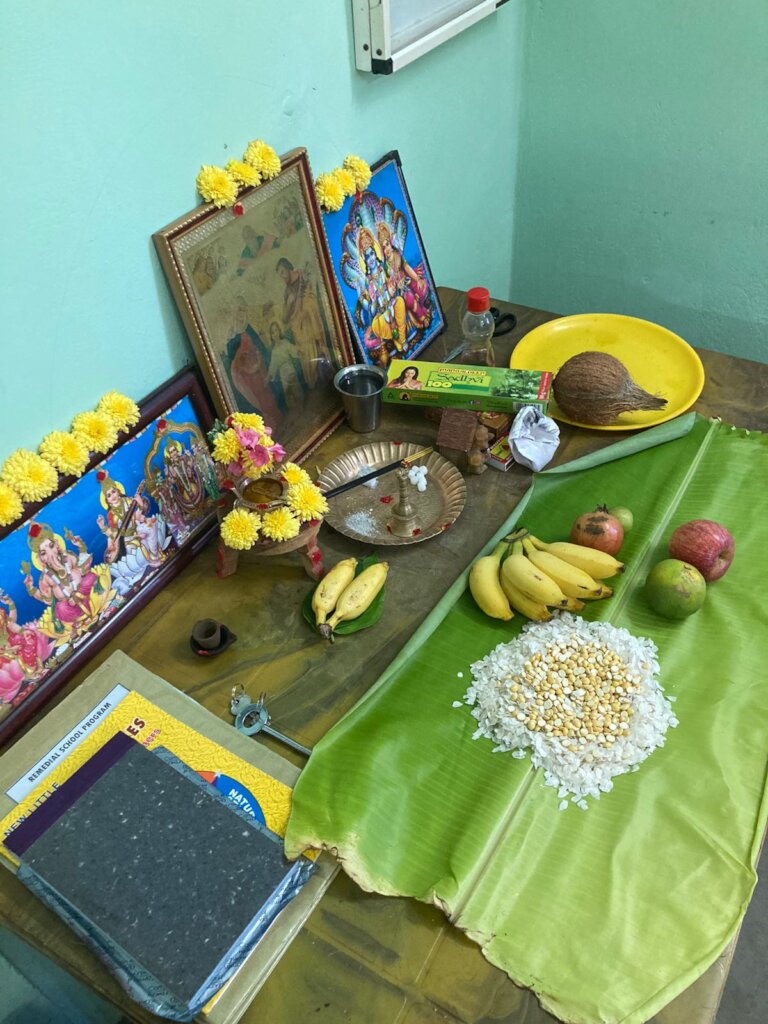 During the pooja, families and businesses arrange their tools and belongings neatly, decorate them with flowers, and apply turmeric and vermilion. Offerings such as fruits, sweets, and coconuts are made, and prayers are chanted to seek blessings from the divine for productivity and safety.
