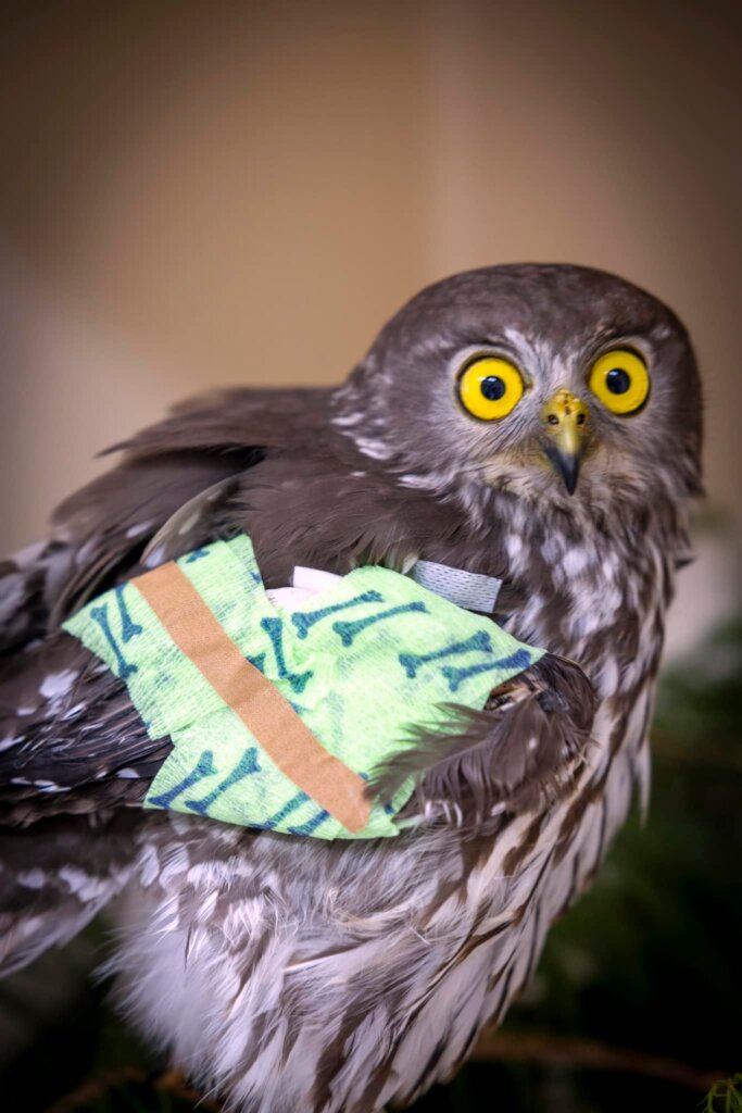 Grace the barking owl receiving around the clock care after undergoing surgery at the Australia Zoo Wildlife Hospital.