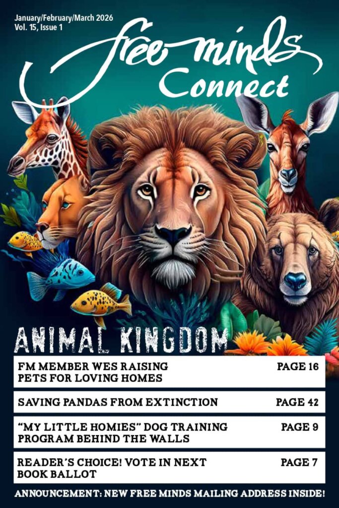 The latest issue of our Connect magazine celebrates the theme “Animal Kingdom,” featuring pieces by and for members of the Free Minds community, including poetry, art, interviews, feedback on the Books Across the Miles selection, and more. This edition emphasizes the importance of the relationship between humans and animals, as demonstrated by members who have been able to participate in dog training programs, for example. Members who submitted poetry to be featured in this edition used animals as a source of inspiration for writing, demonstrating how the natural world can be a magnificent site of creative expression. Many of these poems draw upon animals and nature in an innovative manner to represent their circumstances of incarceration as well, highlighting the importance of creative writing as a mode of healing. Free Minds member JS does a beautiful job of representing this in an excerpt from his poem, “Sparrow”: