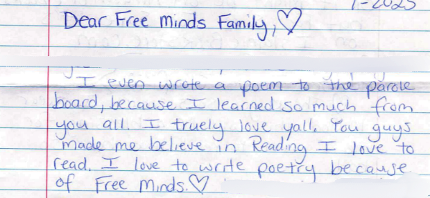 On February 25th, we held a virtual Write Night over Zoom where we were joined by two Poet Ambassadors who shared such reflections on what receiving mail meant to them and offered encouragement to those who might be feeling trepidation about starting to write. Poet Ambassador KB talked about the significance of receiving mail with supportive comments that encouraged him to continue writing, which helped him start to see Free Minds as his family in an environment that frequently tears families apart. KB said that comments of that nature “touch the heart and the soul of people who need them,” further describing them as “rejuvenating for the soul.”
