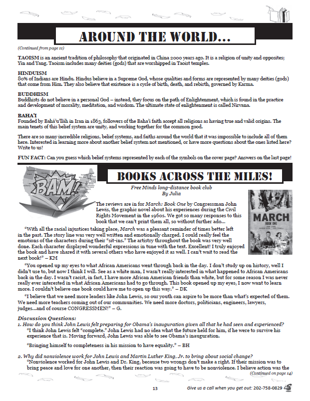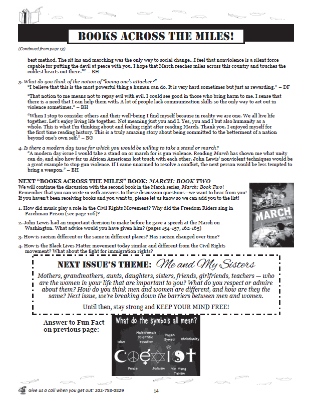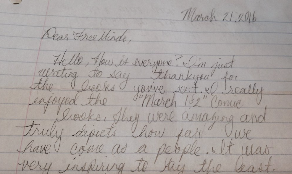 Meanwhile, the young adults incarcerated in federal prison have been reading about another activist with a remarkable life, Congressman and civil rights icon John Lewis (D-GA). In our last update, the readers were discussing March: Book One, the first graphic novel in a trilogy about Congressman Lewis’s experiences as one of the “Big Six” leaders of the Civil Rights Movement. The response was so overwhelmingly positive that, by popular demand, we are shipping over 200 copies of March: Book Two to members of the “Books Across the Miles” long-distance book club in over 40 facilities in 20 states.