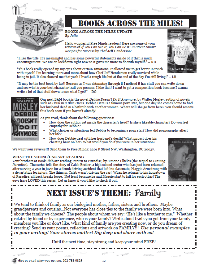 Our next issue of the Free Minds: Connect, will focus on Family, both biological and those who have earned that place in our lives. Poems around the topic have already arrived at the office, and we can’t wait to read even more about how our members continue to create family wherever they are.