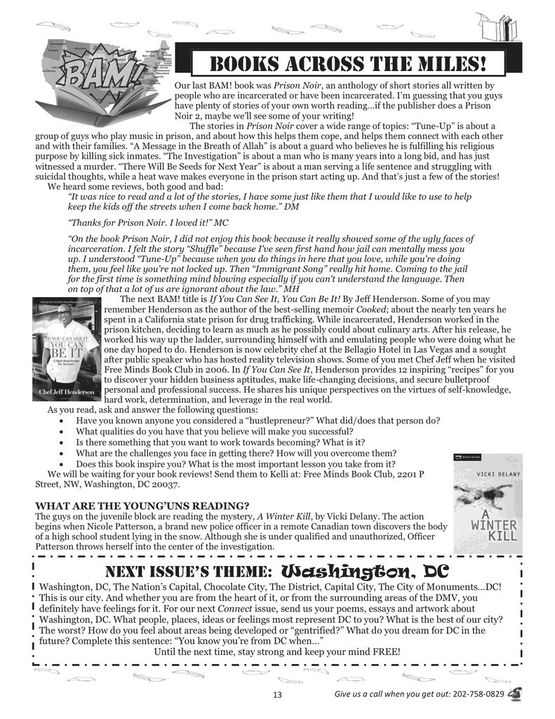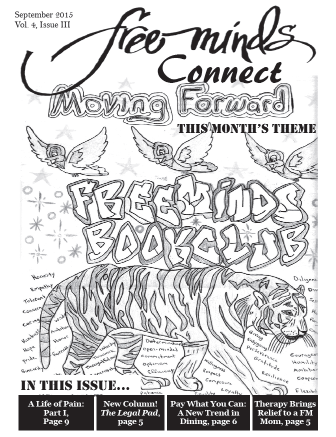 In September, we mailed out another issue of our bimonthly newsletter, which focused on the theme “Moving Forward.” Free Minds member JG, who writes a regular column for the Connect, talked about how moving forward reminds him of flowing water: