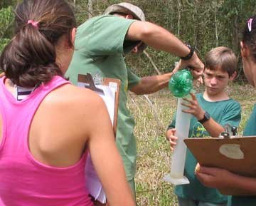 Here I am taking a water sample. We’ve learned how to test for ph, turbidity, conductivity, temperature and water flow. This is really interesting because it has to do with the quality and quantity of our water. We’re also collecting data on rainfall, using our weather station as well as rain gauges we made ourselves to use at home.