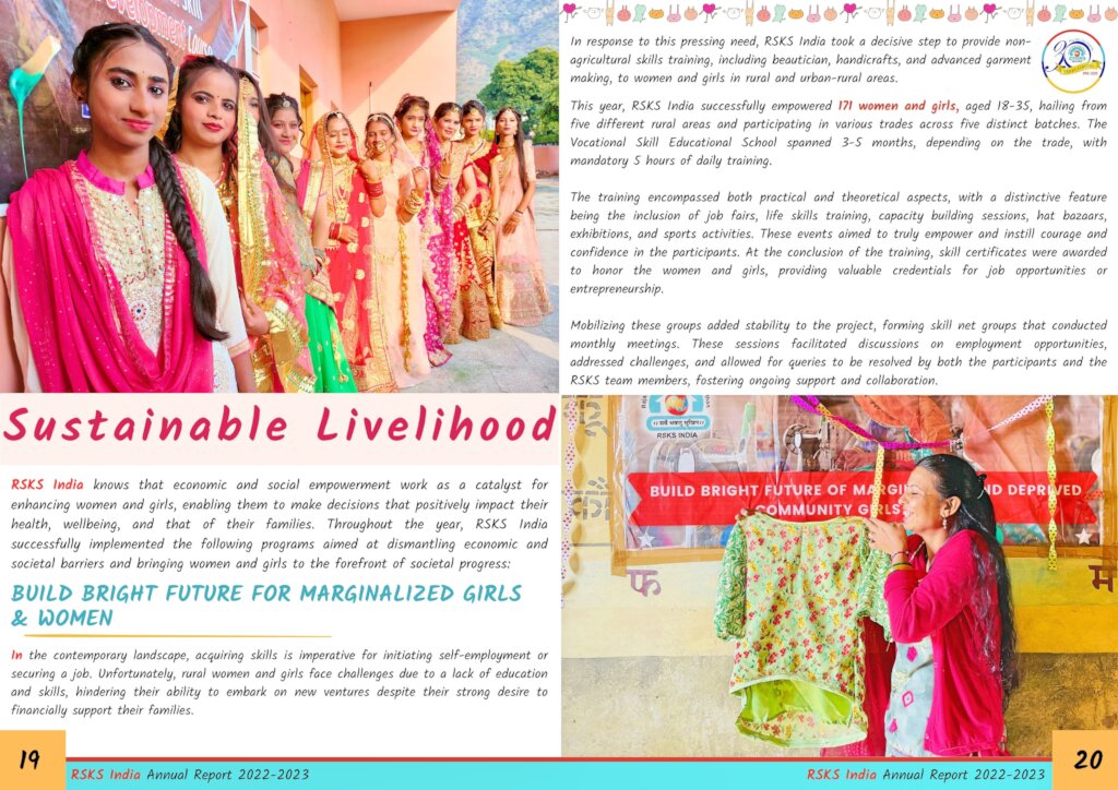 In the year 2023, Rajasthan Samgrah Kalyan Sansthan (RSKS India) brought transformative change to thousands of marginalized women and children. Through better livelihood initiatives, healthcare provisions, educational support, skill development training, and humanitarian relief efforts, the organization positively impacted numerous lives. This accomplishment was made possible by your generous contributions, playing a pivotal role in RSKS's significant endeavors. The guidance, webinars, and training provided by the GG Team empowered our team, enabling enhanced grassroots community welfare. We express our gratitude to the Respected Donor and GG for their unwavering support.