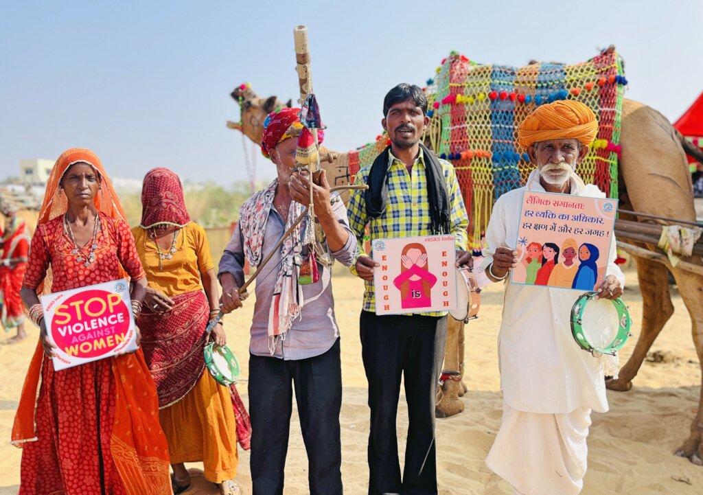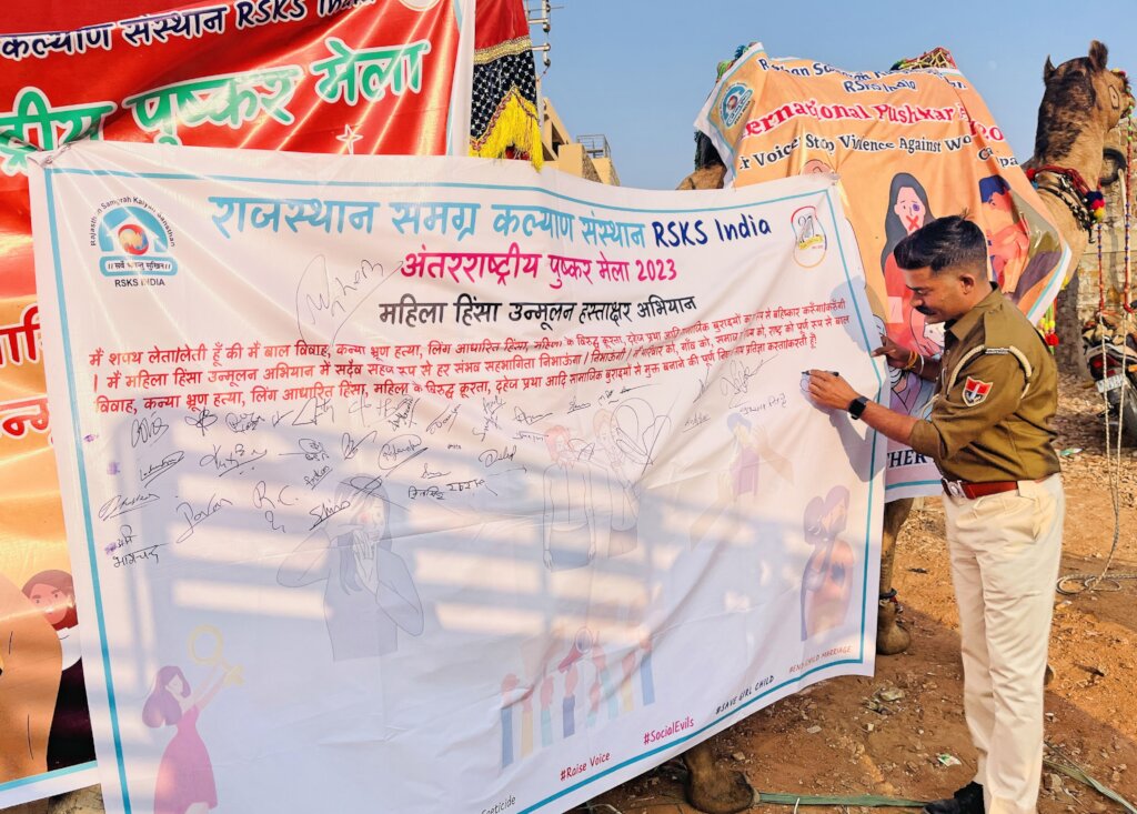 Rajasthan Samgrah Kalyan Sansthan organized the International Pushkar Fair Celebration Program to aware the national as well as international visitors. The RSKS team utilized various engaging methods, including Camel Cart Awareness, Signature Campaigns, My Selfie Campaigns, and Puppet shows, to communicate key messages on ending child marriage, stopping gender-based violence, eliminating violence against women, and eradicating the dowry system. This strategy was aimed to capture the attention of diverse audiences and facilitate a better understanding of these pressing issues. Additionally, feedback was also taken from visitors, allowing direct interaction with the participants. This feedback was invaluable in refining and improving the program for future iterations.