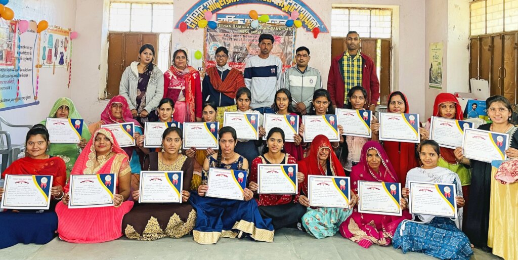 The Advanced Garment Making Vocational Educational School run by the Rajasthan Samgrah Kalyan Sansthan has been providing training to young women and girls in the field of garment making. Upon successful completion of the course, the students are awarded certificates of completion. Without these certificates the trainees would be frustrated and disappointed, and they will not be able to showcase their skills and knowledge to potential employers. Certificates are stars on your shoulders as it builds confidence among the person who is going to be your potential customer.