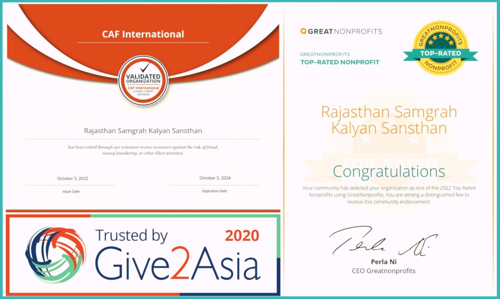1. Top Rated Non Profit 2022:- Rajasthan Samgrah Sansthan has got the award from "Great Non Profit" organisation, U.S.A. for the "positive review" of partners, stackholders, donors and public. The best NGO having positive reviews is awarded every year. More important, Rajasthan Samgrah Kalyan Sansthan has been winning the award for last Seven years continuously.