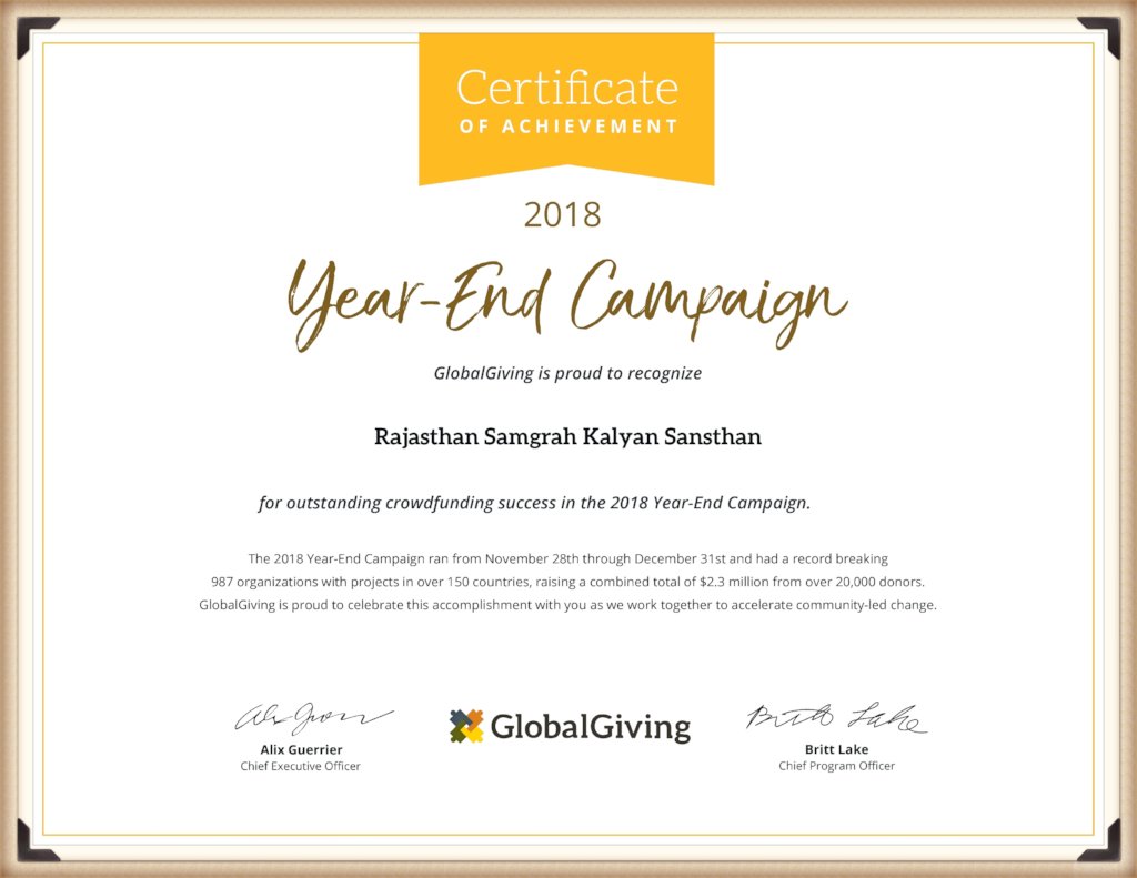We are so glad to inform you that GlobalGiving has recognize Rajasthan Samgrah Kalyan Sansthan for outstanding crowdfunding successes in the 2018 year END.