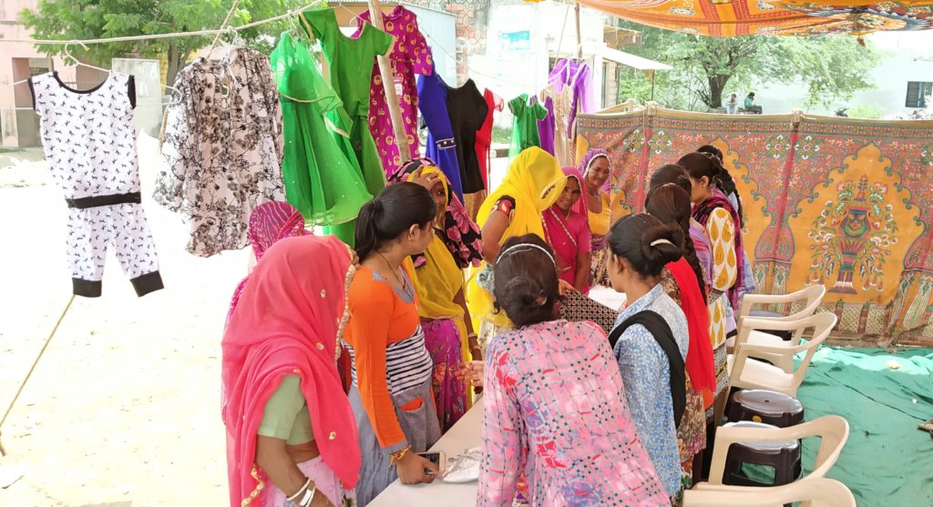 Rajasthan Samgrah Kalyan Sansthan also organized a hat bazar(sale) cum exhibition so that the trainees may learn marketing strategies. The trainees of bag making training and garment making training participated in the exhibition cum sale enthusiastically where the products made by them were exhibited. Rural women appreciated the products and bought them that motivated the trainees. The officials of the village were also present in the exhibition and appreciated the hard work of the trainees and wished for their bright future.