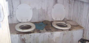 Covers building materials for one toilet cubicle (cement, bricks, wood, roofing).