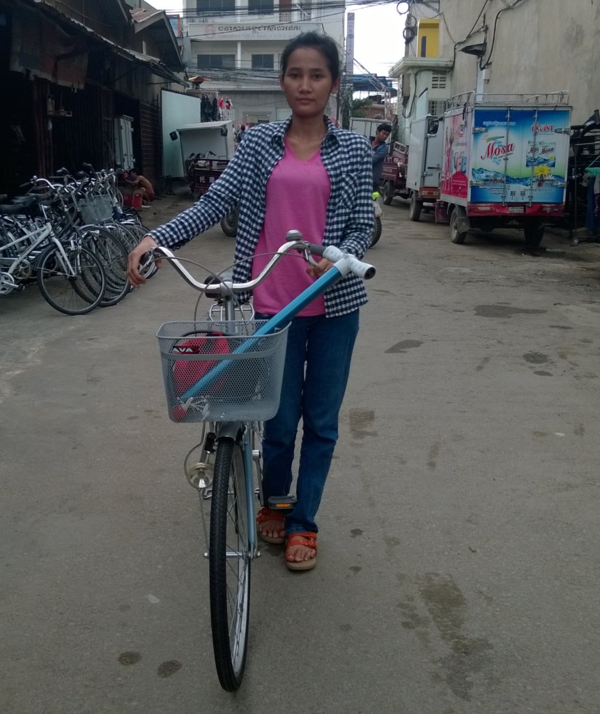 Currently Kanha is studying nursing in year II at Chenla University in Phnom Penh. She is renting a house that is far from her university but less expensive. She faces a lot of problems with traveling to school. Transportation in Phnom Penh city is expensive, which she can’t afford to pay for it every day. In order to go to school everyday, she goes with her friend who has motorbike and is studying at the same university. However, depending on her friend for rides is very difficult with different university schedules. She often missed her classes or arrives late. To ease her commute to school and to respond to her need, the program provided her with a bicycle, which helps her to get to school.