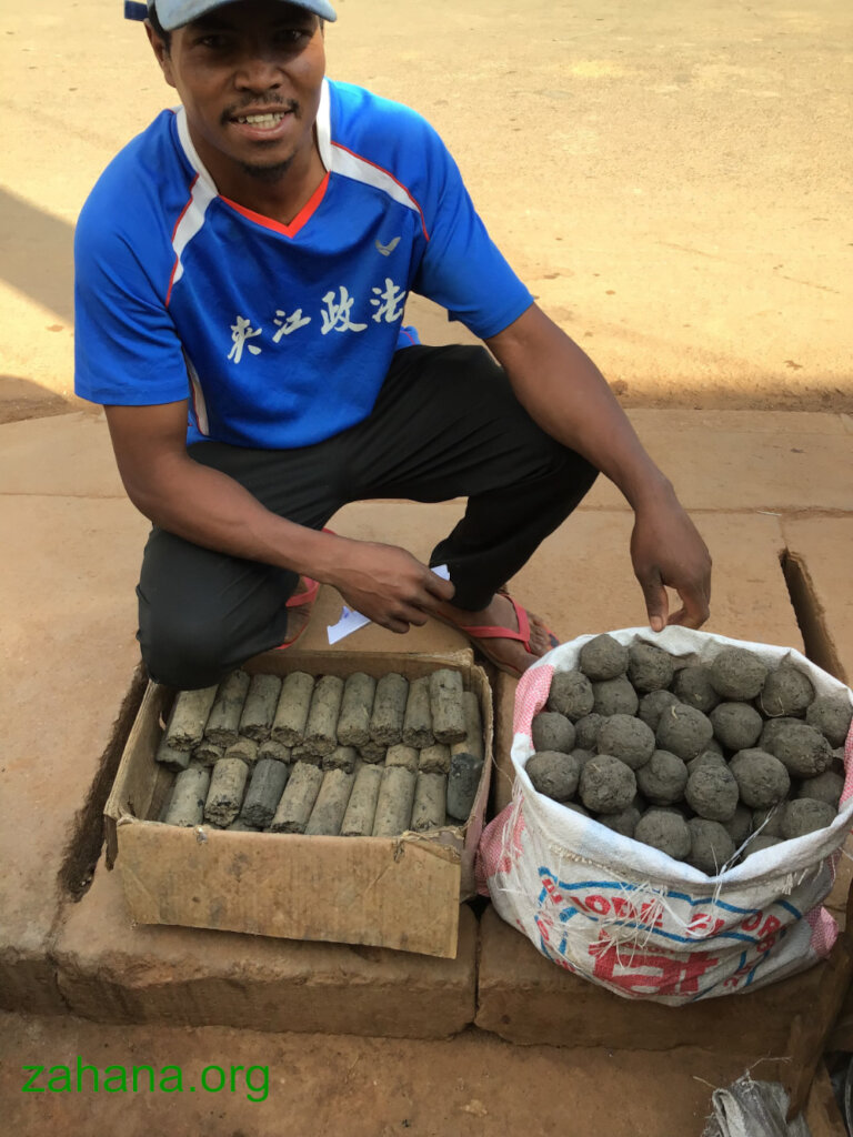 At the moment, this team manages to sell their bio charcoal in the market in Tsiroanomandidy, the next town nearby. In town people cannot just take a walk into the countryside to collect firewood and are forced to buy their firewood or charcoal to cook already anyway. In this initial phase they sell 100 pieces of bio charcoal per day at the rate of 100 Ariary per unit.