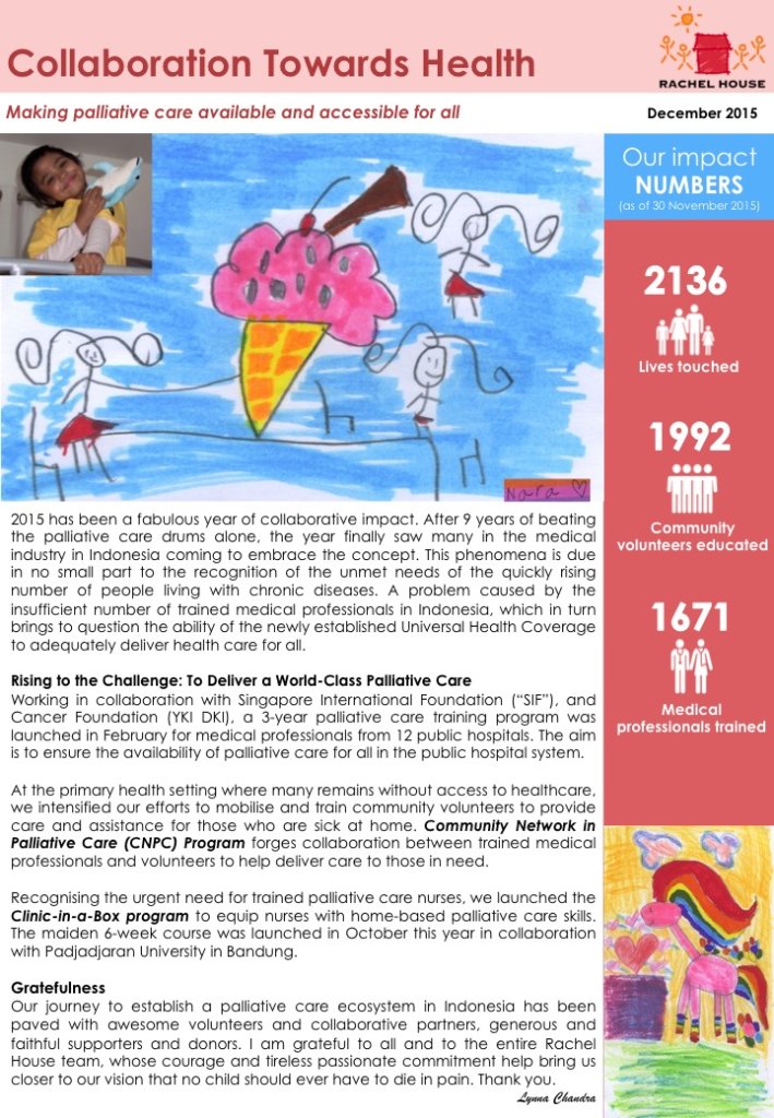Teguh passed away less than two weeks after the trip to the zoo. A few of us went to his funeral to see him buried alongside his mother. The sounds of his laughter and the memory of the joy on his face left a huge imprint in my heart, and in the hearts of many at Rachel House. Although I am sad that he had lived such a short life, I am comforted by the knowledge that we had brought love and happiness to the brief time he was under our care – and this gives me courage and determination to continue my work as a pediatric palliative care nurse at Rachel House.”