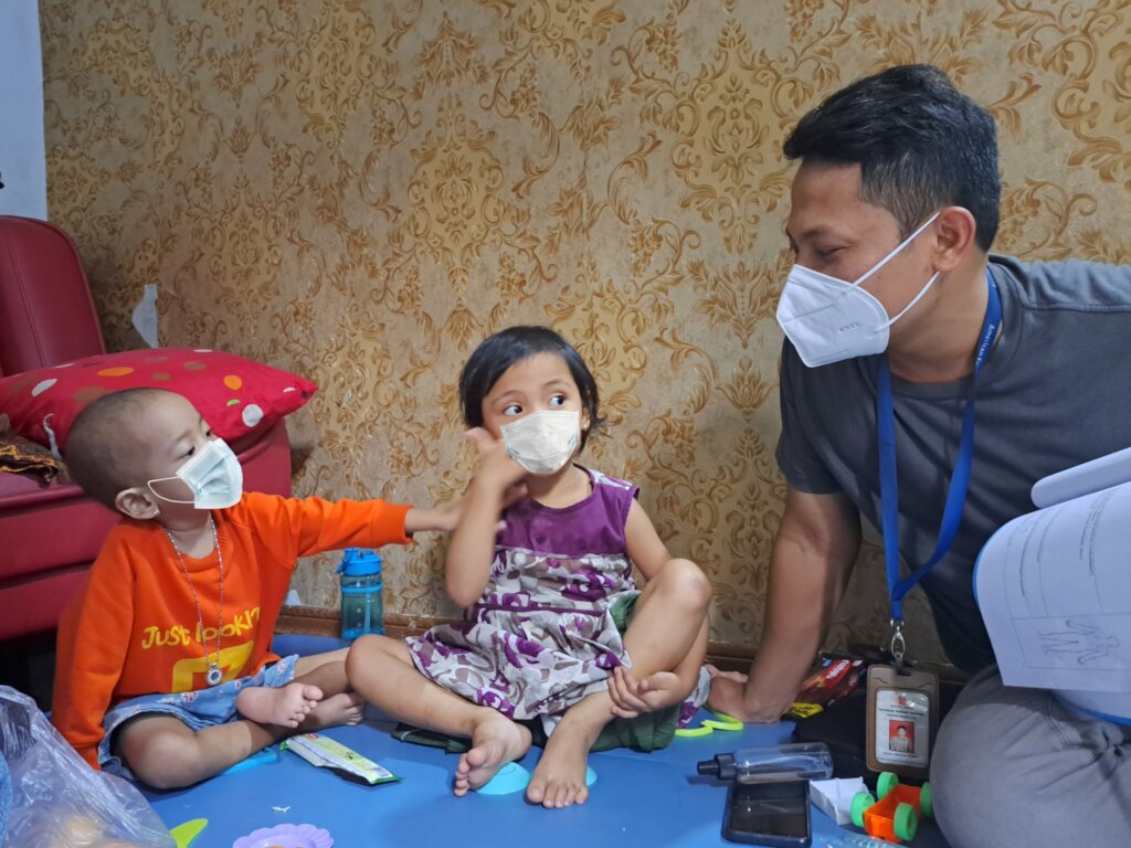 I have been to numerous home visits with Rachel House nurses. However, our visit to Syafa was particularly lively and cheerful thanks to the antics of these two little cousins, taking turns requesting examinations, sharing drawings on paper, competing for snacks, and laughing while watching cartoons on TV.