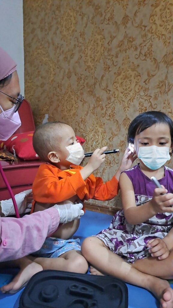 During the physical examination, Syafa eagerly handed Jil a handful of the tools the Nurses were using, like a small flashlight, a piece of colorful paper, and a pulse oximeter. Not wanting Jil to be left out, Syafa begged the nurse to examine her cousin also. And when she saw Nurse Tyas give Jil a colorful pen and paper, she exclaimed not wanting to be left out, "I want some too!"