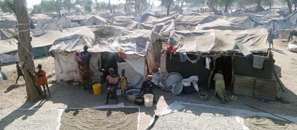 Kuernyang has become home to over 20,000 refugees. Heaving rains in September forced people to abandon their homes and find higher ground. Now they are packed into camps with hundreds of tarped covered homes. It is a food crisis that is compounded by a lack of clean drinking water.