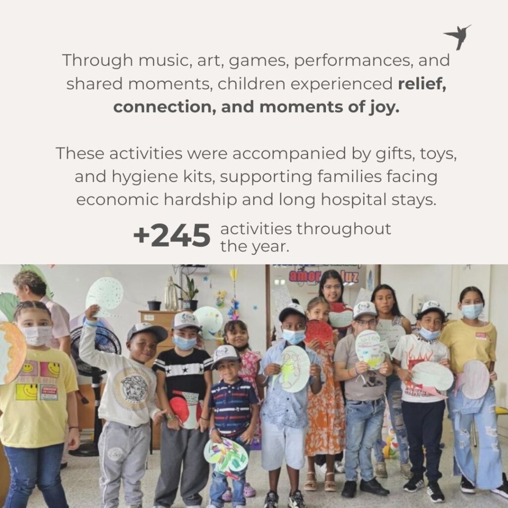 Through music, art, games, performances, and shared moments, children experienced relief, connection, and moments of joy. These activities were accompanied by gifts, toys, and hygiene kits—supporting families facing economic hardship and long hospital stays.