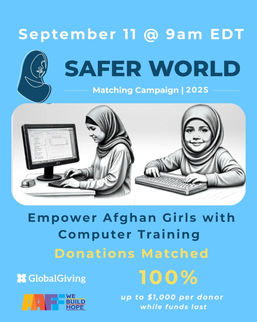 You can support more Afghan girls in this project by donating to AAFF’s Empower Afghan Girls with Computer Training project during GlobalGiving’s Safer World Fund Matching campaign, which begins at 9am EDT on September 11. One donation per donor up to $1,000 will be matched 100% while funds last!