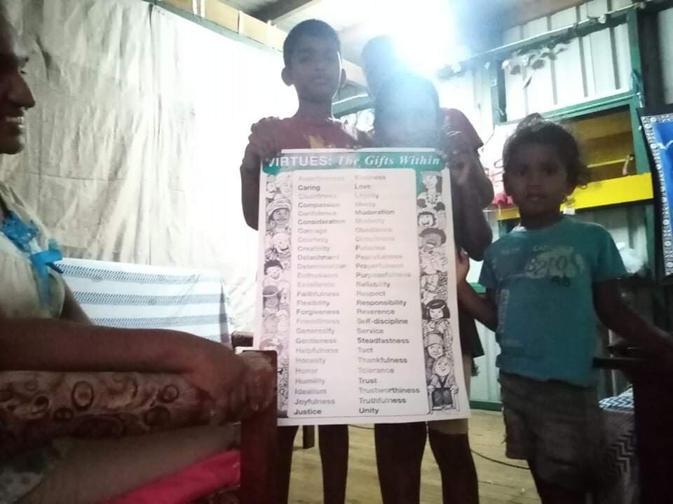 The two women were from the target community of Koroipita. They immediately set their plans to work in that community. The households are clustered in groups of ten so each of the women would work in her cluster, teaching the families how to use the 5 strategies of The Virtues Project and giving them a set of cards and a virtues poster. In less than two weeks 13 household had been introduced to the project with set plans to revisit and support the families as they learn to deal use these strategies to work with their children.