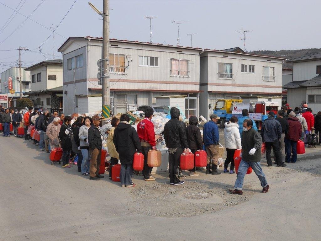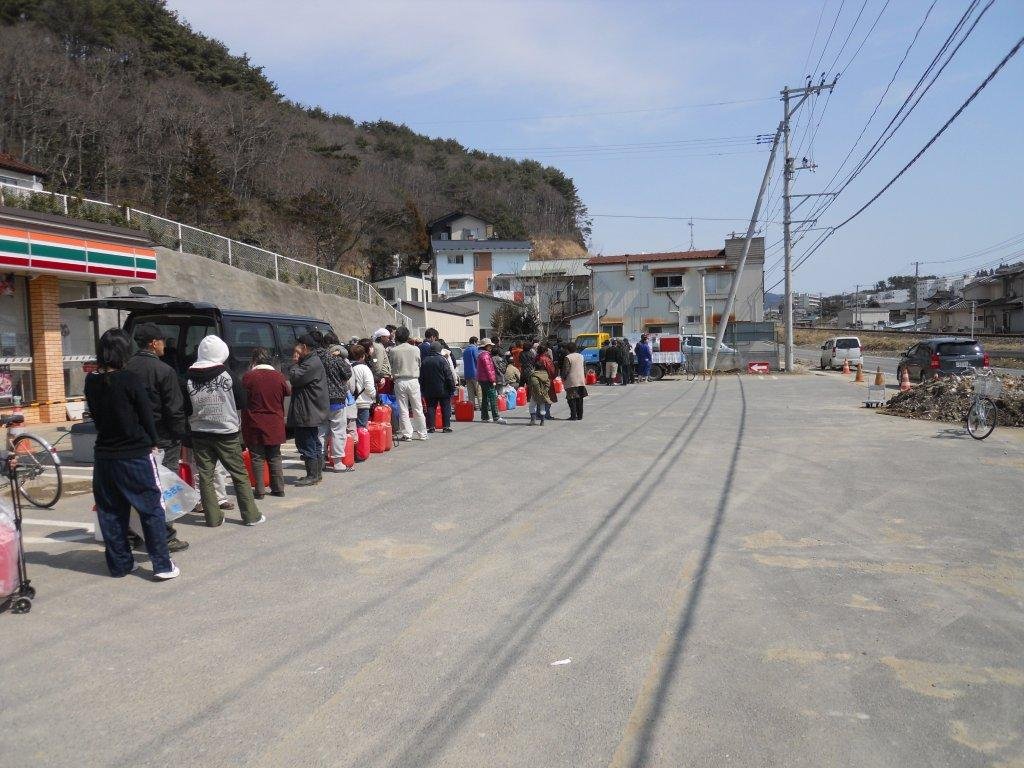 Today, in a neighborhood where the Tsunami waterline shows at about three meters high, a group of six young boys were taking turns practicing with a single skateboard. Our translator, Kenji Christopher Suzuki, who is an accomplished surfer, went over to them to give them some examples of good skateboard technique. He mounted the board and after a series of beautifully done moves, received resounding applause from the boys and the people waiting in line for fuel. We laughed and clapped together. Happiness and joy is what he brought out in all of us. That’s all it took. We found that part of us, the part that knows life must go on and is happy for it, and we shared that wonder for a moment.”