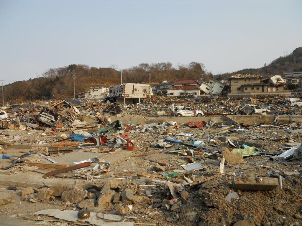 I knew there would be a Tsunami and I was worried about my Dad, who I knew would be driving from Ishinomaki. I ran into the house and got dressed, got all my important stuff together in my pack, shut the breakers off on the house and got in my car and drove up the hill, to the old school that was on higher ground. I left my car up there and ran back down to help get the older people up the hill. At that time my Dad returned and we did this together. I was glad to see him. All the people in our part of the Hama were up high now and we watched the sea. I saw a big bulk of water, like a lump, pass in the sea going toward Ishinomaki. Part of it wrapped around the jetty in front of our Hama and came to our area. The sea pulled away and came back up with a roaring sound into the lower houses and you could hear crunching and breaking sounds – snapping and cracking like lumber breaking. The second wave came up and began pushing houses off foundations. Everyone was in bewilderment. Smaller Tsunamis continued – maybe 16 or 17 in all. After that there were more aftershocks and it started to get dark. I didn’t sleep that night or the next. On day three I walked into Ishinomaki. ”