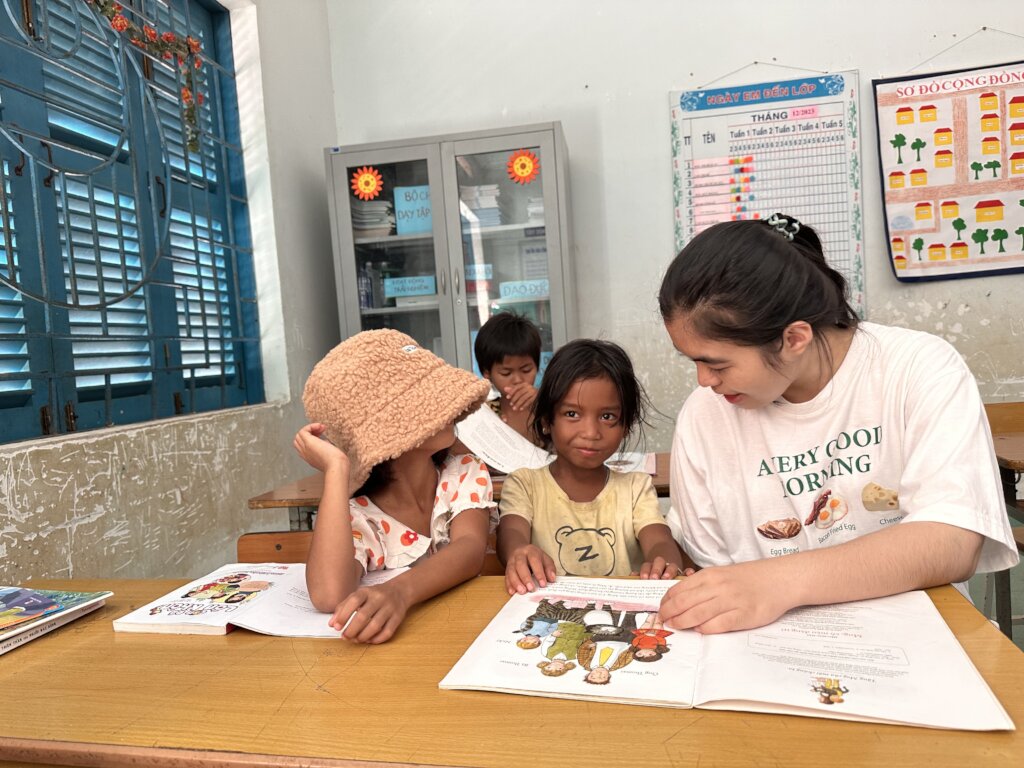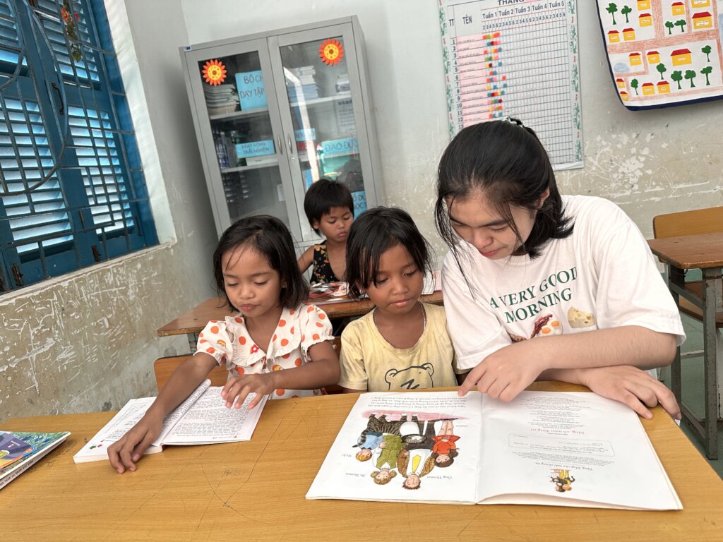 Along with this report there are a few photos of Anh, including one of her in the village of Son Tan, reading to some of our young students in our reading program there. Anh is one of 20 girls who are in our mentoring program, and who work with small groups of girls in the village. Of course they occasionally just like to take a break from reading and be silly together!