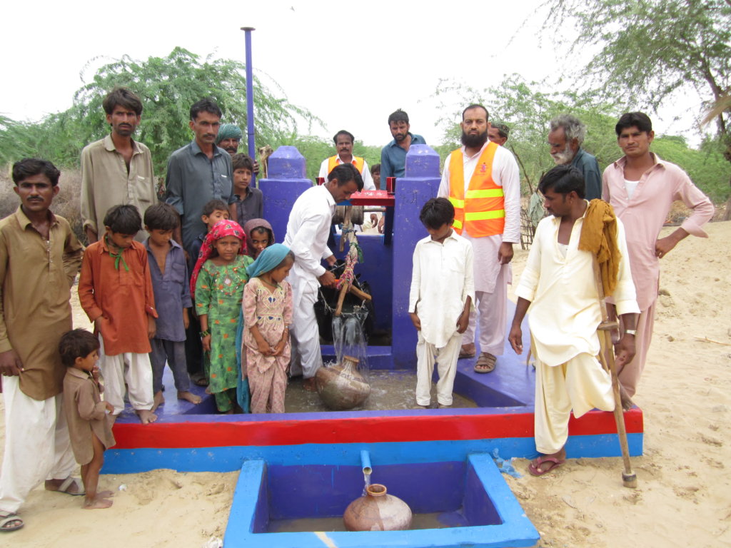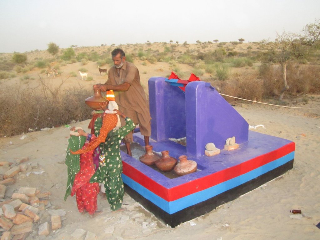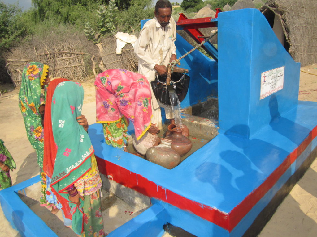 The goth (village) Lakhi Tobu is a small village of Thar which is located on Islam Kot-Nangar Parkar Road 40 K. M. from Islam Kot and 25 K. M. from Nangar Parkar. Most of the population this village consists of poor Hindu Community. There was no water well in the area and the poor Hindu women have to daily travel 5-6 K. M. to fetch water for the their families. The team of Customs Health Care Society working on the drinking water for 40 villages of Thar project visited the area and was requested by the inhabitants for a water well in their goth. Seeing the emergent need of water and the poor conditon of the inhabitants, the digging of the water well was immediately started and after two months of digging, the sweet, fresh and hygienic water emerged from the water well. The news of fresh water from the well spread like a Jungle Fire and people of the goths specially the women and children gathered to celebrate the occassion. Some women of the goth cooked sweet rice and distributed the same among the children and women. The women of the goth are very happy to find a well of the sweet water at their door steps. Now they have more time to look after their children.