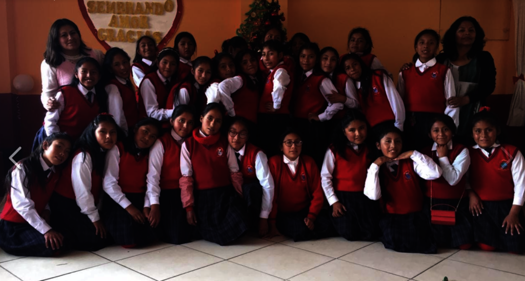 CW 2019 School year ends tomorrow for summer. The new year will start next March 2020 for schools in Peru. Party activities take the stage now along with the holiday cookie making by the Bakery school girls and our returning alumnae girls, seen with Ruth, for the party. Our Alumnae girls at the University and in Vocational College are taking their finals the last few days of this school year so will come late. The 6th grade Honor Guard passes the torch to the 5th grade for 2020 seen in photo.