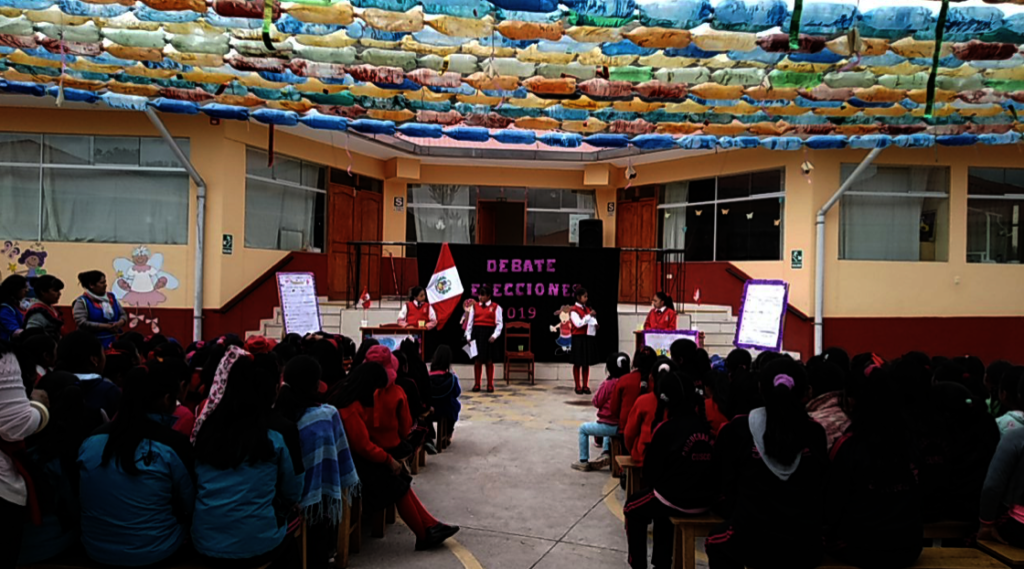All girls participate in the school's mayoral election, as if it were the Peruvian Presidential election, to learn how to vote..so they then can teach their parents. Here you can see the moderated debate between the final candidates. All students vote.