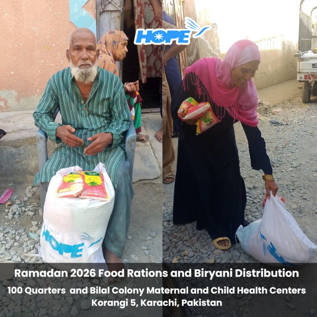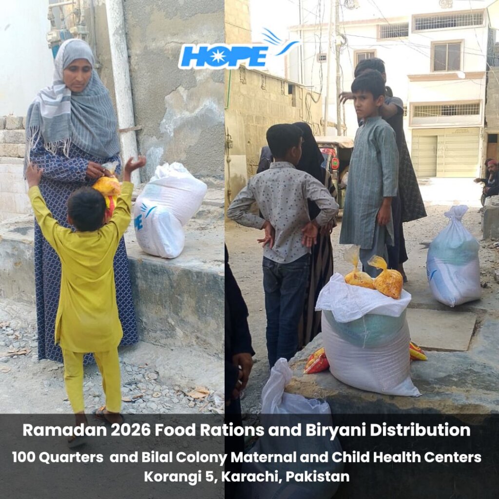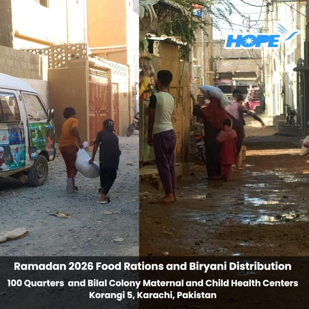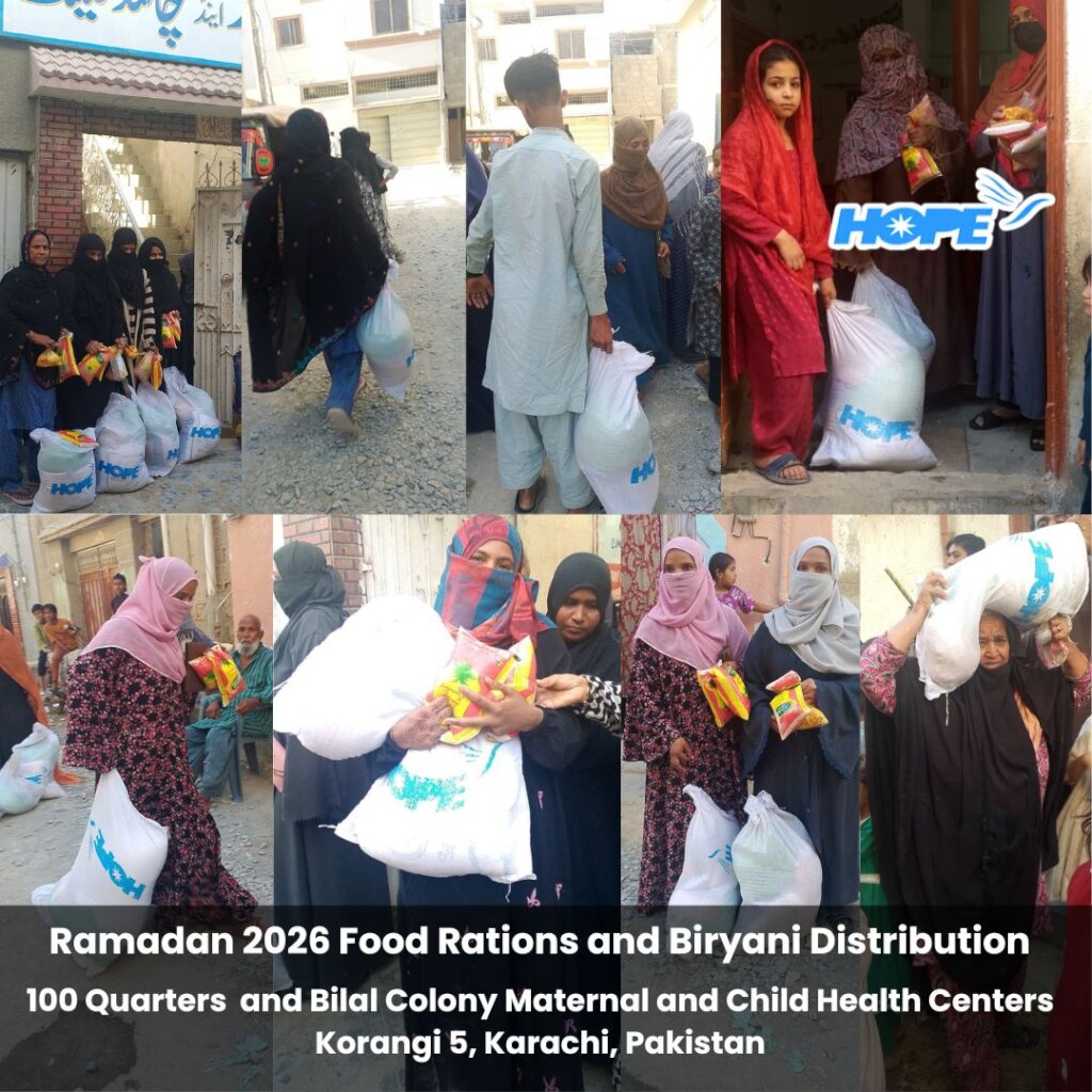 Our Food Rations and Biryani efforts have amped up in time for Eid!  On March 16, 200 families received Food Rations and Biryani to take home.  Distribution took place at 100 Quarters and Bilal Colony Maternal and Child Health Centers situated in Korangi, Karachi, Pakistan.  Korangi is a low-income inner city region in Karachi where HOPE has established Healthcare, Education, and Vocational Training facilities to uplift the underserved population.