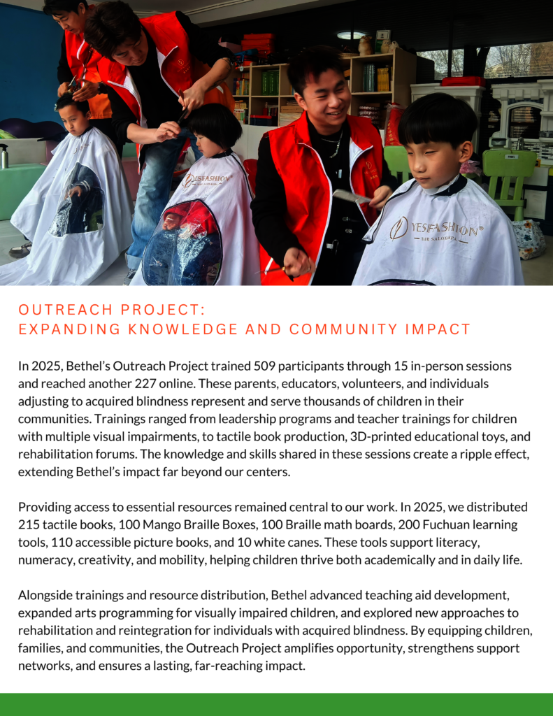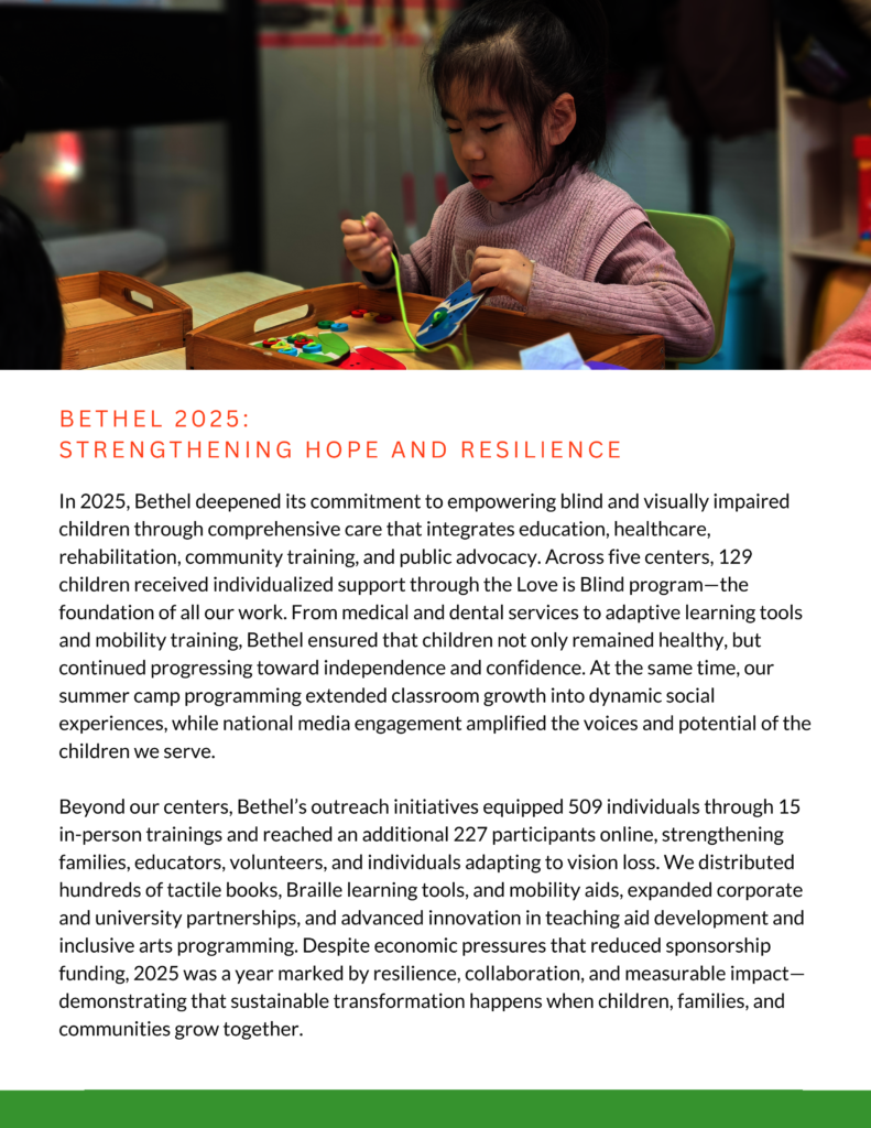 Beyond our centers, Bethel’s outreach initiatives equipped 509 individuals through 15 in-person trainings and reached an additional 227 participants online, strengthening families, educators, volunteers, and individuals adapting to vision loss. We distributed hundreds of tactile books, Braille learning tools, and mobility aids, expanded corporate and university partnerships, and advanced innovation in teaching aid development and inclusive arts programming. Despite economic pressures that reduced sponsorship funding, 2025 was a year marked by resilience, collaboration, and measurable impact—demonstrating that sustainable transformation happens when children, families, and communities grow together.