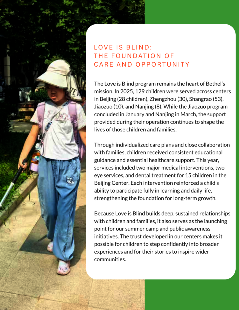The Love is Blind program remains the heart of Bethel’s mission. In 2025, 129 children were served across centers in Beijing (28 children), Zhengzhou (30), Shangrao (53), Jiaozuo (10), and Nanjing (8). While the Jiaozuo program concluded in January and Nanjing in March, the support provided during their operation continues to shape the lives of those children and families.