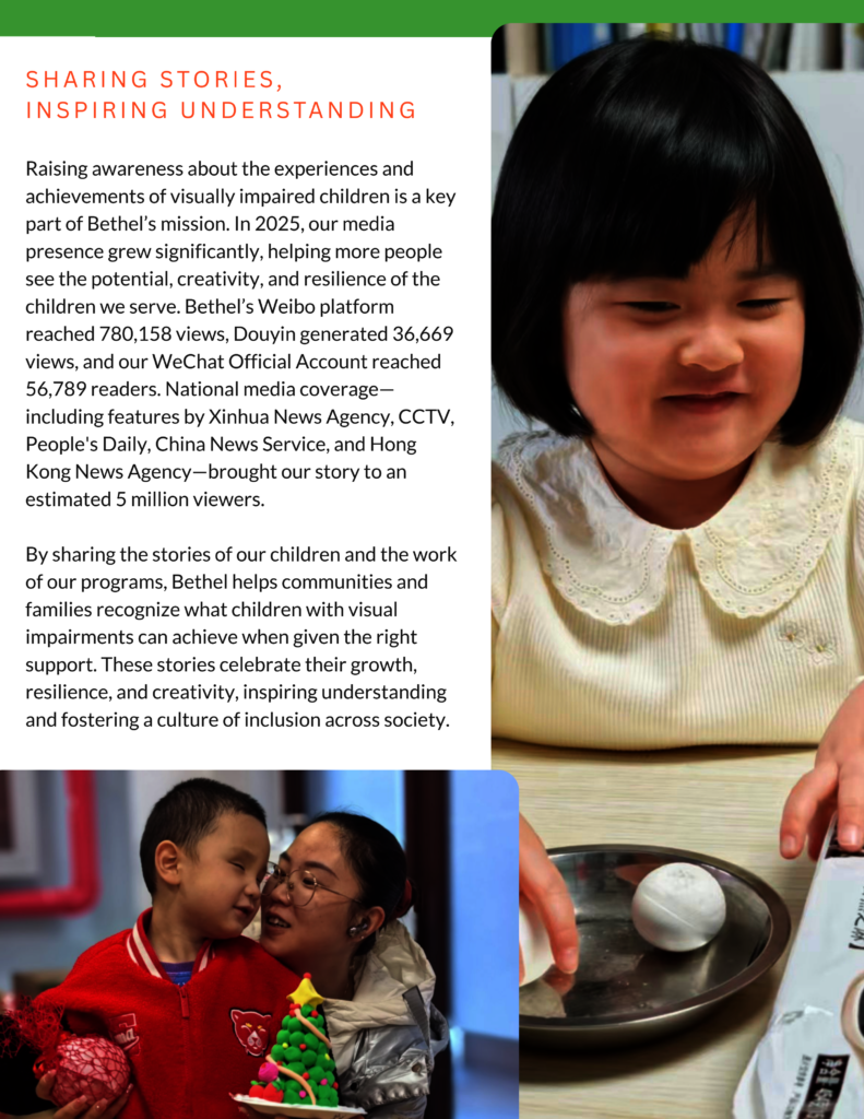 Raising awareness about the experiences and achievements of visually impaired children is a key part of Bethel’s mission. In 2025, our media presence grew significantly, helping more people see the potential, creativity, and resilience of the children we serve. Bethel’s Weibo platform reached 780,158 views, Douyin generated 36,669 views, and our WeChat Official Account reached 56,789 readers. National media coverage—including features by Xinhua News Agency, CCTV, People's Daily, China News Service, and Hong Kong News Agency—brought our story to an estimated 5 million viewers.