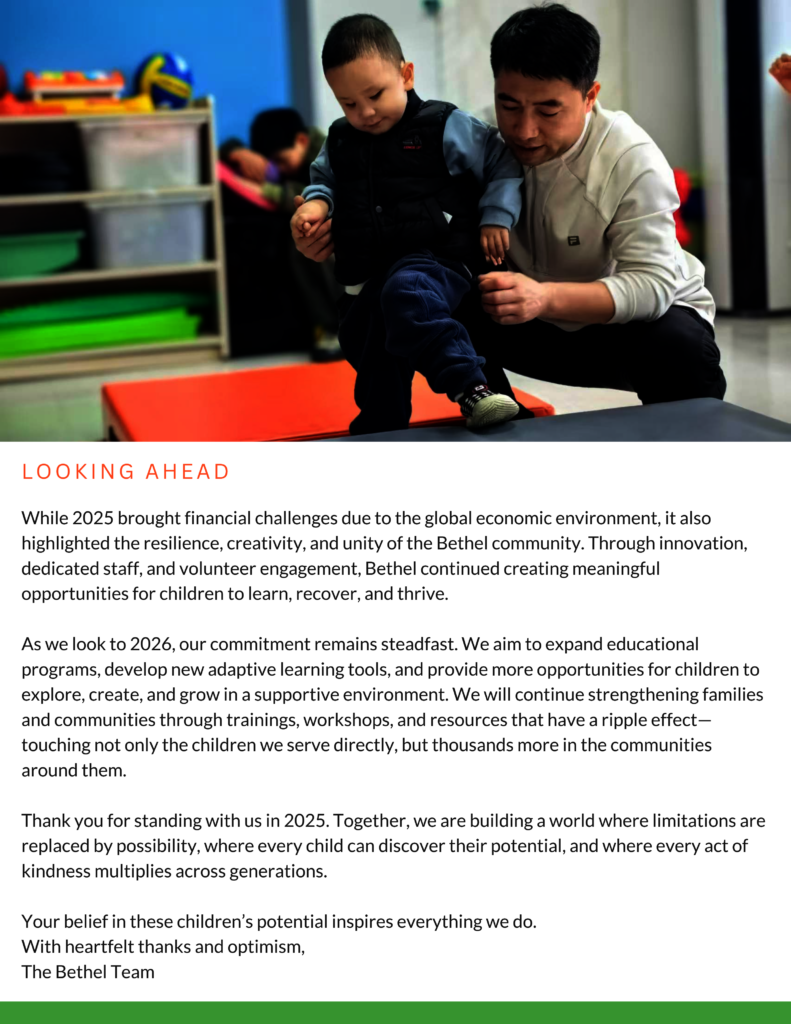 While 2025 brought financial challenges due to the global economic environment, it also highlighted the resilience, creativity, and unity of the Bethel community. Through innovation, dedicated staff, and volunteer engagement, Bethel continued creating meaningful opportunities for children to learn, recover, and thrive.