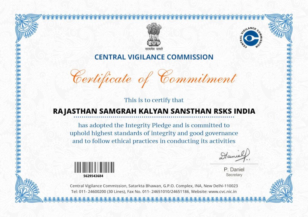 2. Certificate of Commitment:- Central Vigilance Commission (Govt. of India) has awarded Rajasthan Samgrah Kalyan Sansthan to maintain a better level of Vigilance. RSKS India has adopted the highest standards of integrity and good governance. In the consequences, Central Vigilance Commission has been awarding Rajasthan Samgrah Kalyan Sansthan with "Certificate of Commitment"