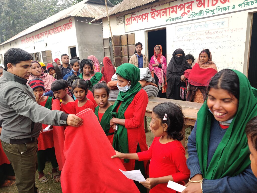 (Unknown) Children with Neurodevelopment Disorder students one of the target beneficiaries of our education program. They are living rural area different parts of Islampur Upazilla under Jamalpur district. It is northern part of Bangladesh. Parents are lives with in hard core poverty. Parents have dream to his children for her Fulfill life. Parents were afraid for winter weather to protect their Children. it is big challenge for disable children parents to buy new blanket and others warm clothes and safe from cold and with flue, cold fever and cough in winter due to lack of warm clothes in their families poverty. On the dated 03rd January 2024 we are distributed blanket in to 110 Neurodevelopment Disorder Students of our supported school and most vulnerable children & children very happy with receiving new blanket.
