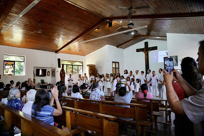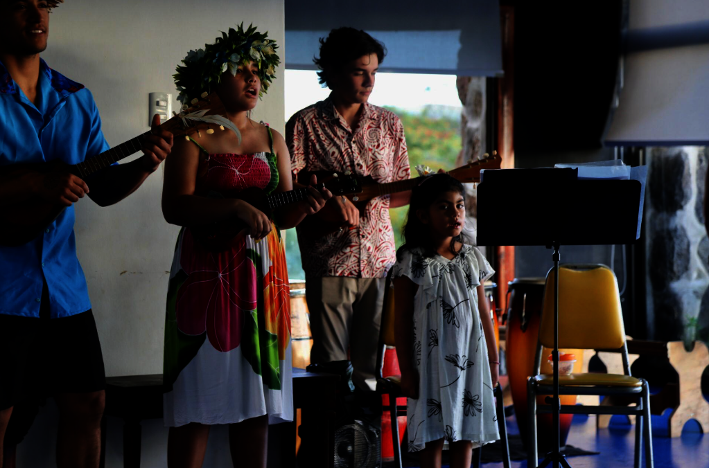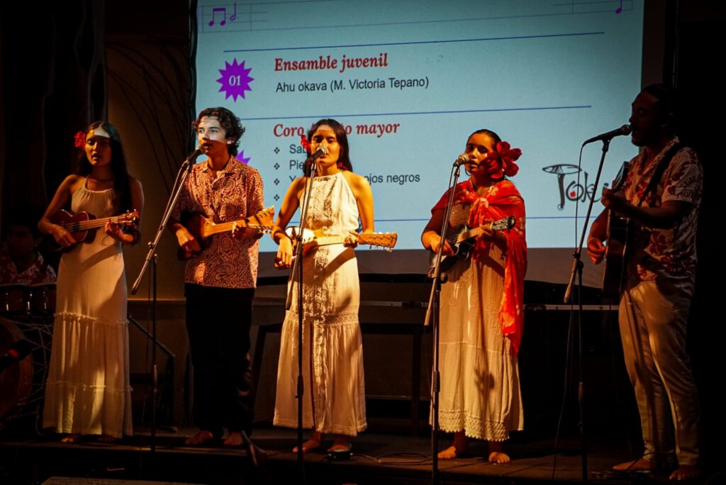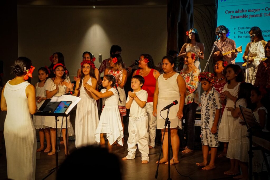 The concert was the result of the work carried out throughout 2025 by teachers Cynthia Lemarie and Hermes Villalobos, and it brought together students from Toki’s music workshops (including the early childhood program that begins at age 3) and the school choir. It also included the participation of the Hare Koa Tiare Senior Center Choir, the Adult Community Choir that rehearses weekly at the church, the children’s residence Hare O Tatou, and students from the Hermano Eugenio Eyraud and Lorenzo Baeza Vega schools.
