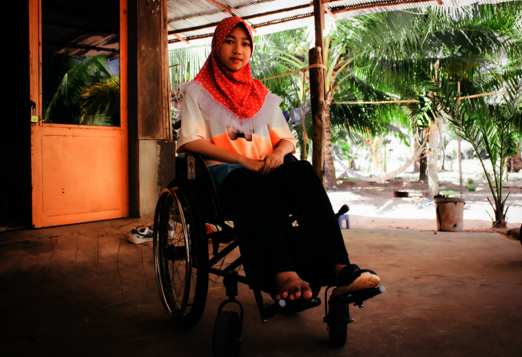 "It was tough before. I didn't study consistently because my legs hurt, and it was hard to go anywhere. I couldn't walk and only jumped [using one leg] a little at home. I like reading, doing homework the teacher gives me, and washing dishes. But my mum doesn't want me to do anything; she fears me falling. I like learning English, Khmer and Islamic literature." – Saroh