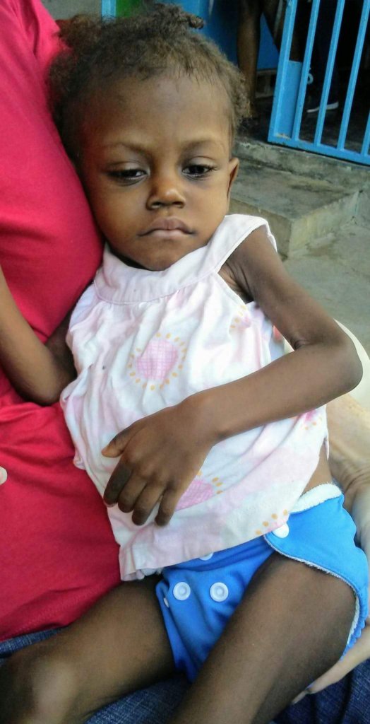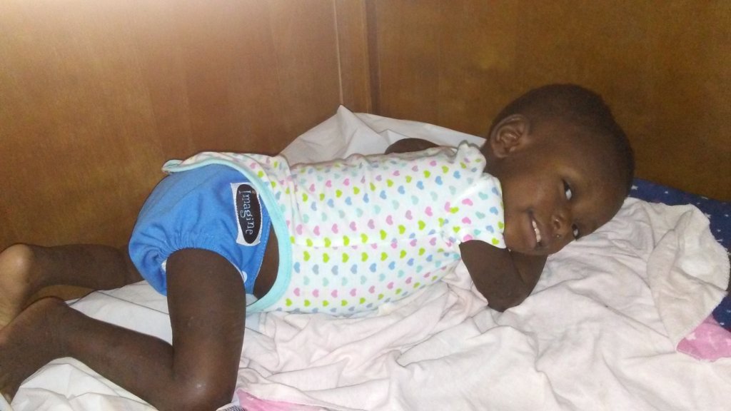 Admitted into the Rescue Center, she now receives a specialized nutritional peanut butter paste, Medika Mamba, which is designed for the treatment of Kwashiorkor. She still fits in the Tiny Blue Diapers, which are designed for tiny babies from 5 to 12 lbs. But not for long!