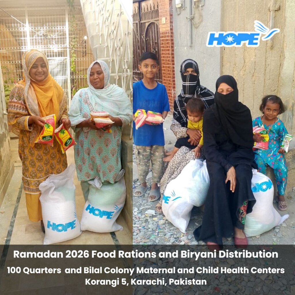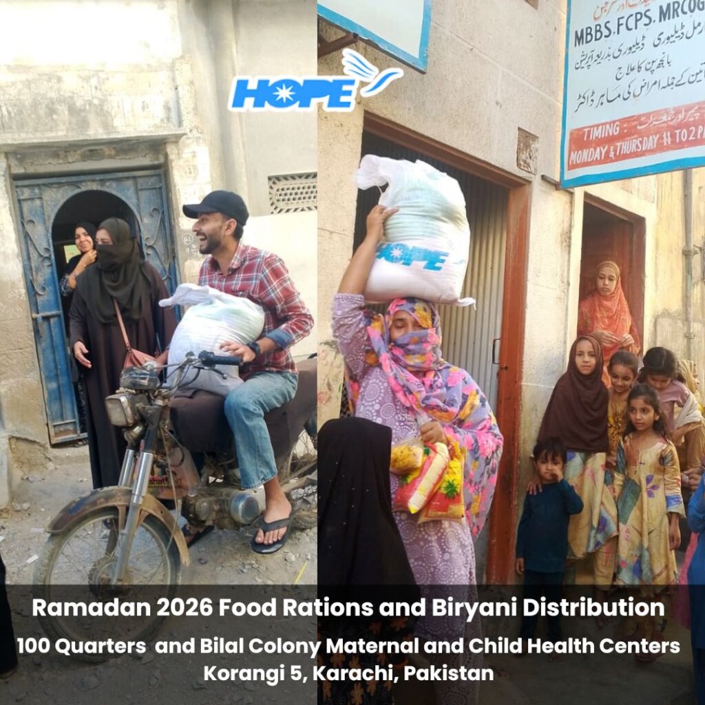 Our Food Rations and Biryani efforts have amped up in time for Eid! On March 16, 200 families received Food Rations and Biryani to take home. Distribution took place at 100 Quarters and Bilal Colony Maternal and Child Health Centers situated in Korangi, Karachi, Pakistan. Korangi is a low-income inner city region in Karachi where HOPE has established Healthcare, Education, and Vocational Training facilities to uplift the underserved population.